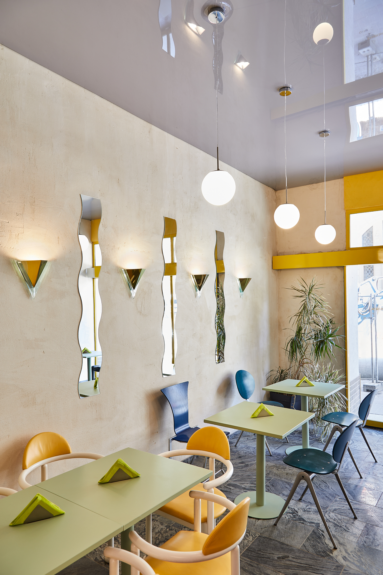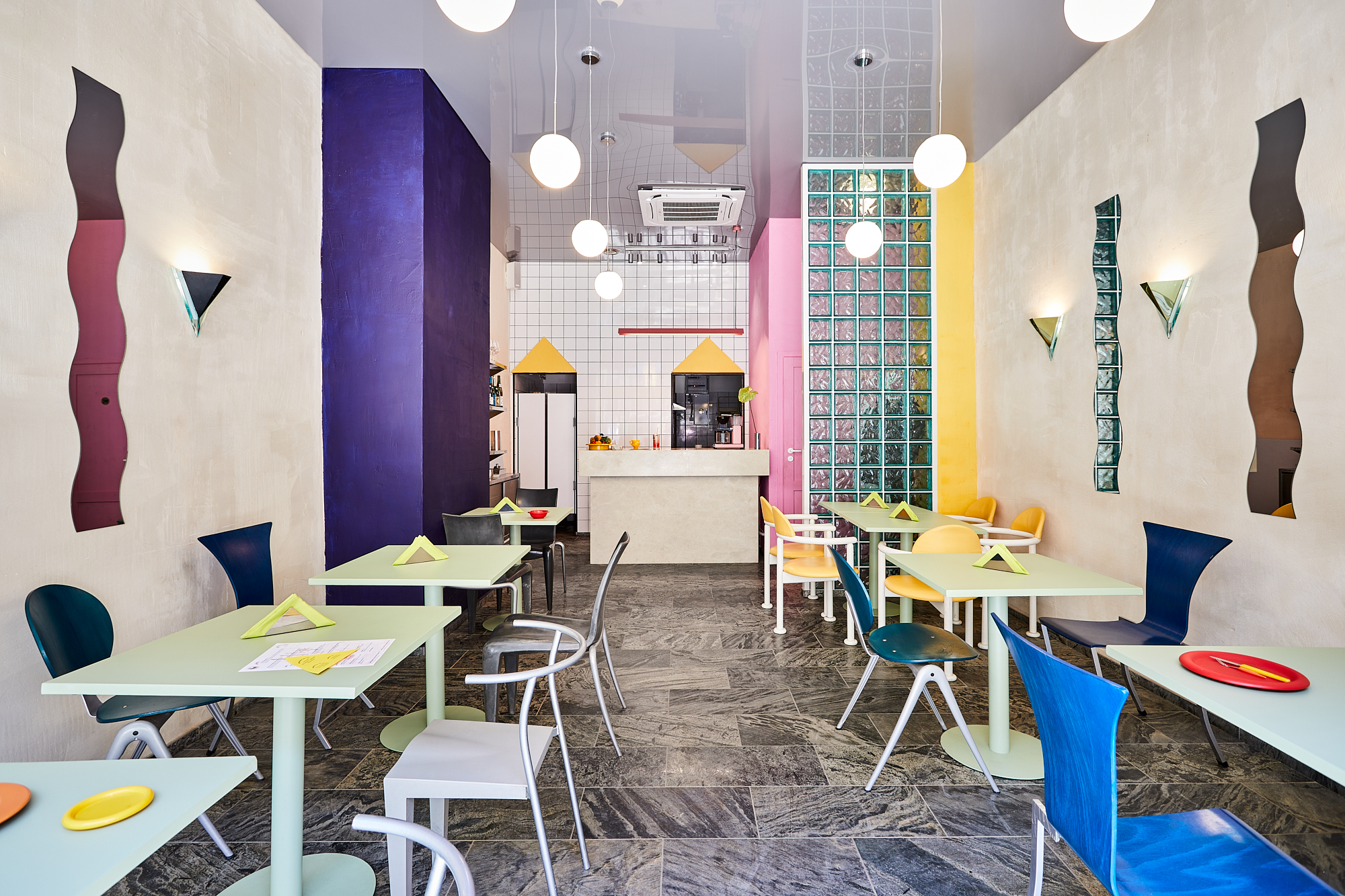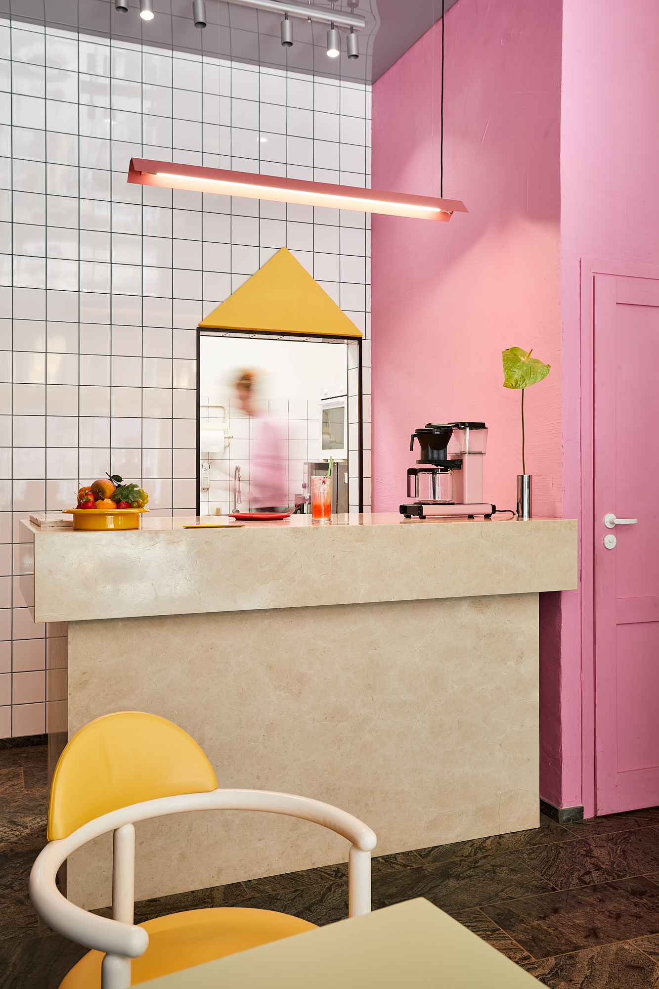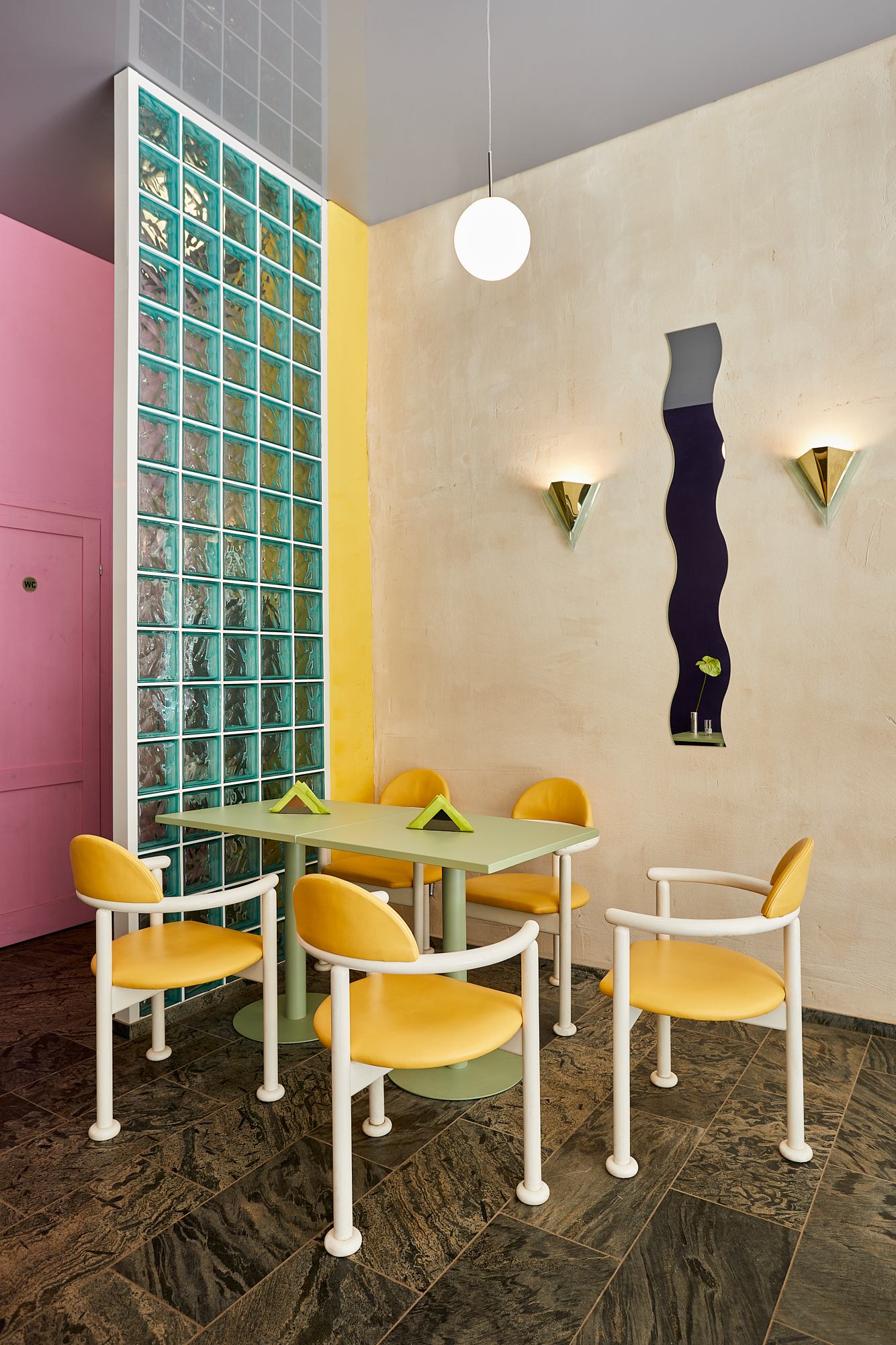 Przeszklona intensywnie żółta witryna z wejściem to pozostałość z lat 90-tych. W Perełce każda ściana jest inna: różowa, kobaltowa, z luksferów, pokryta naturalnym tynkiem lub kwadratowym płytkami. Posadzka i monumentalny bar są wykonane z naturalnego kamienia. Na takiem tle doskonale prezentują się krzesła min.projektu Starca i mix designu z lat 70 i 90 tych. Oświetlenie to mleczne kule, różowa lampa lexavali i kinkiety zbierane przez właścicieli na pchlich targach. Te wszystkie elementy odbijają się w lustrzanym suficie. Jedzenie i napoje podawane są na szkle i porcelanie wyselekcjonowanym przez Lidię. Łazienka to połączenie żółtko- czerwonego gridu z płytek i różowych ścian.