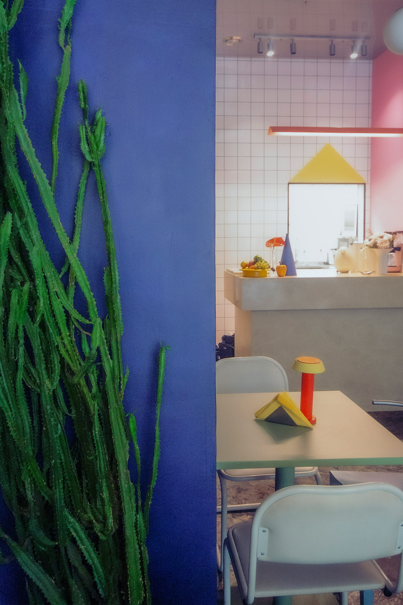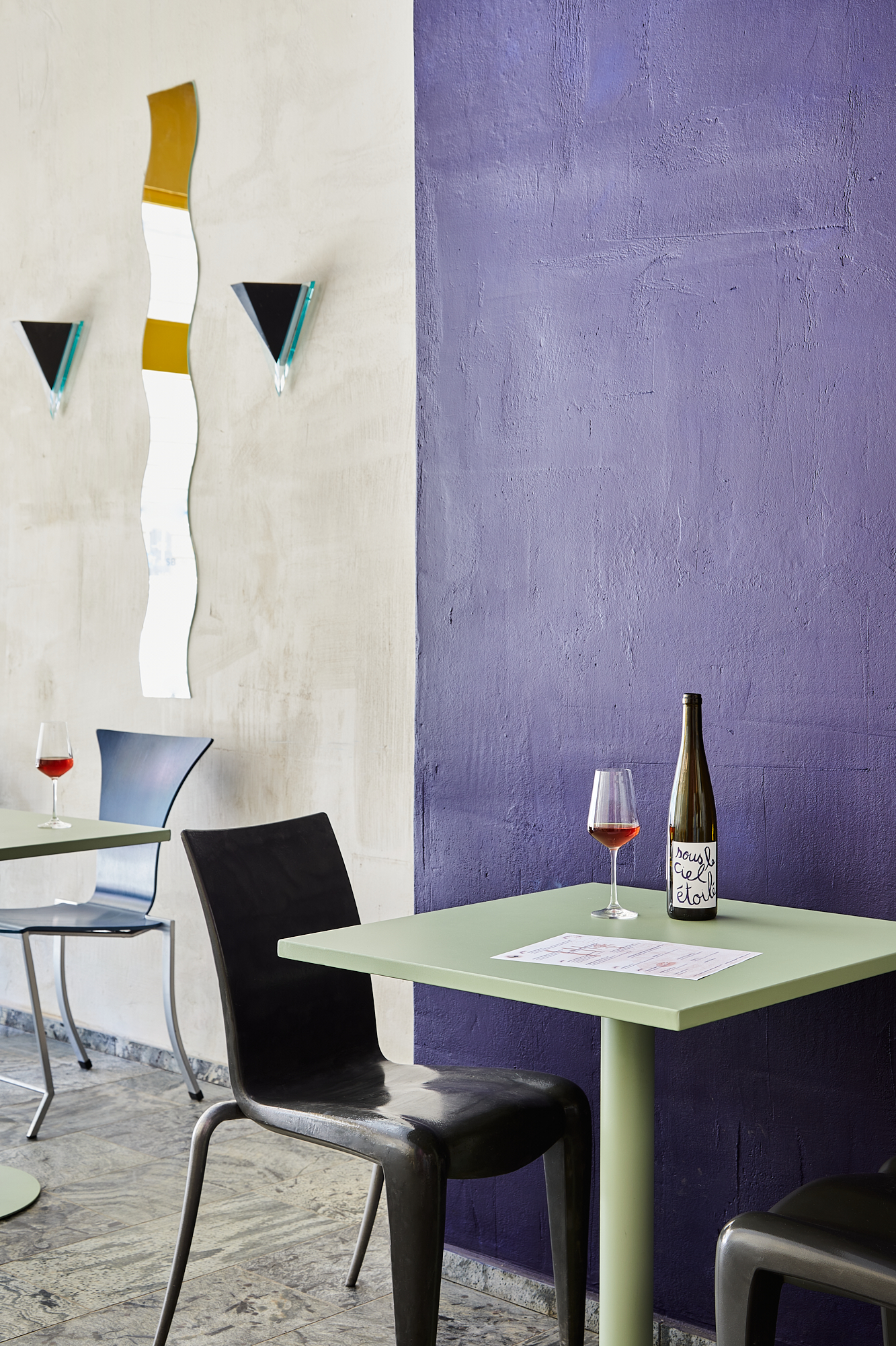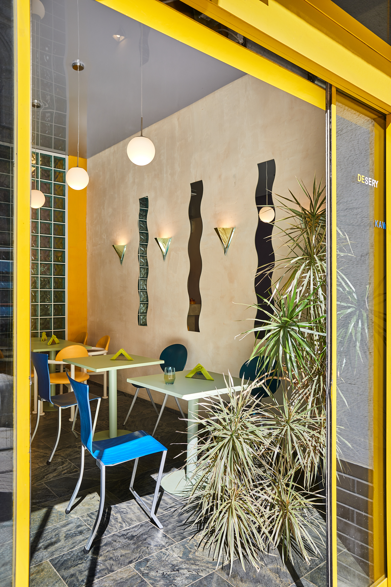 Przeszklona intensywnie żółta witryna z wejściem to pozostałość z lat 90-tych. W Perełce każda ściana jest inna: różowa, kobaltowa, z luksferów, pokryta naturalnym tynkiem lub kwadratowym płytkami. Posadzka i monumentalny bar są wykonane z naturalnego kamienia. Na takiem tle doskonale prezentują się krzesła min.projektu Starca i mix designu z lat 70 i 90 tych. Oświetlenie to mleczne kule, różowa lampa lexavali i kinkiety zbierane przez właścicieli na pchlich targach. Te wszystkie elementy odbijają się w lustrzanym suficie. Jedzenie i napoje podawane są na szkle i porcelanie wyselekcjonowanym przez Lidię. Łazienka to połączenie żółtko- czerwonego gridu z płytek i różowych ścian.