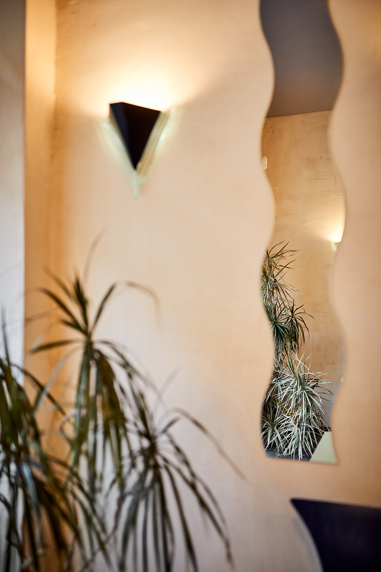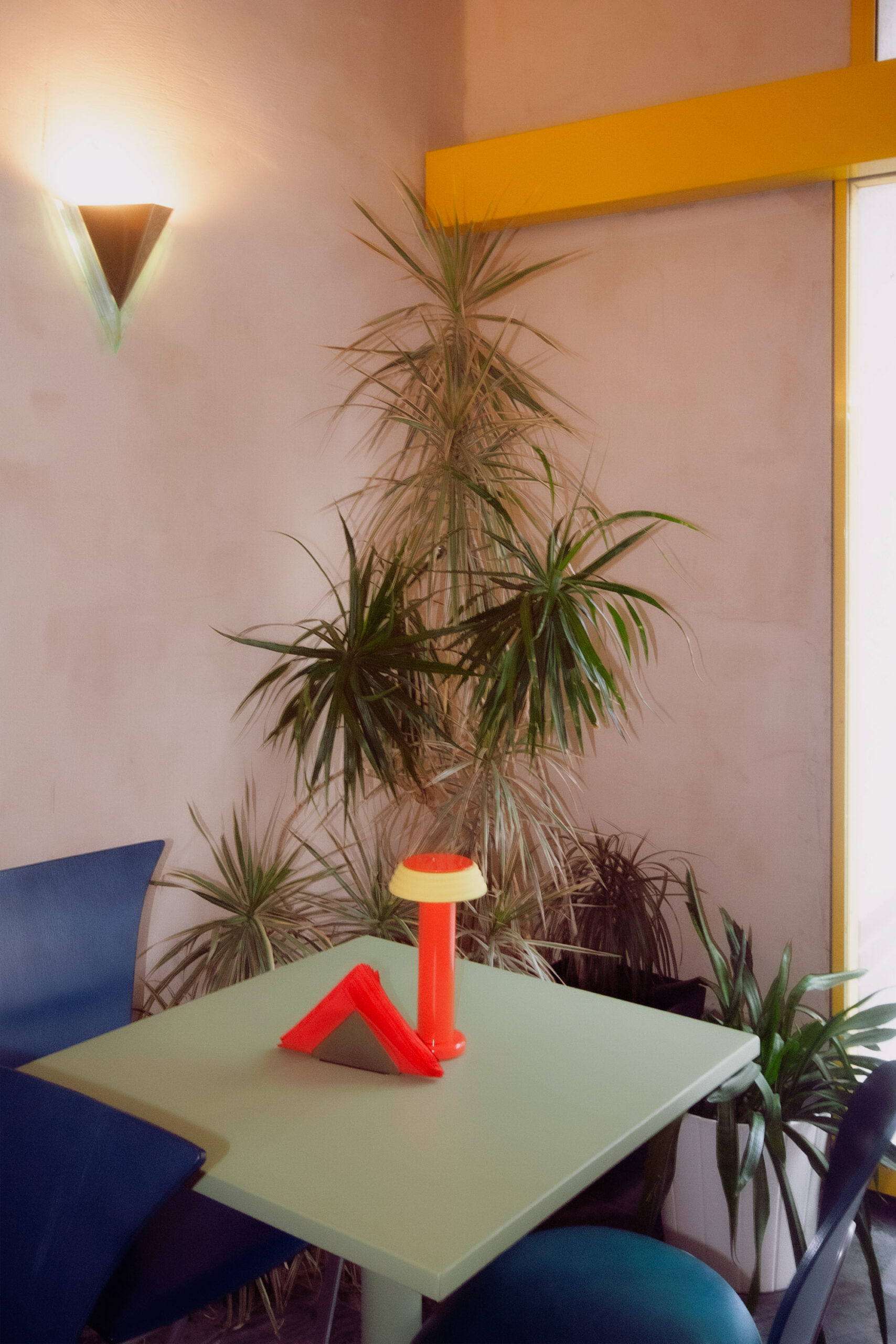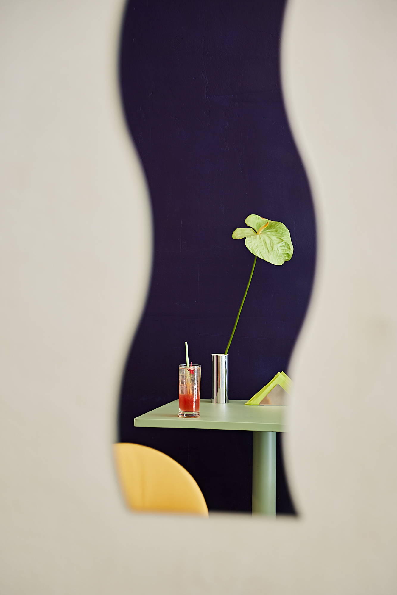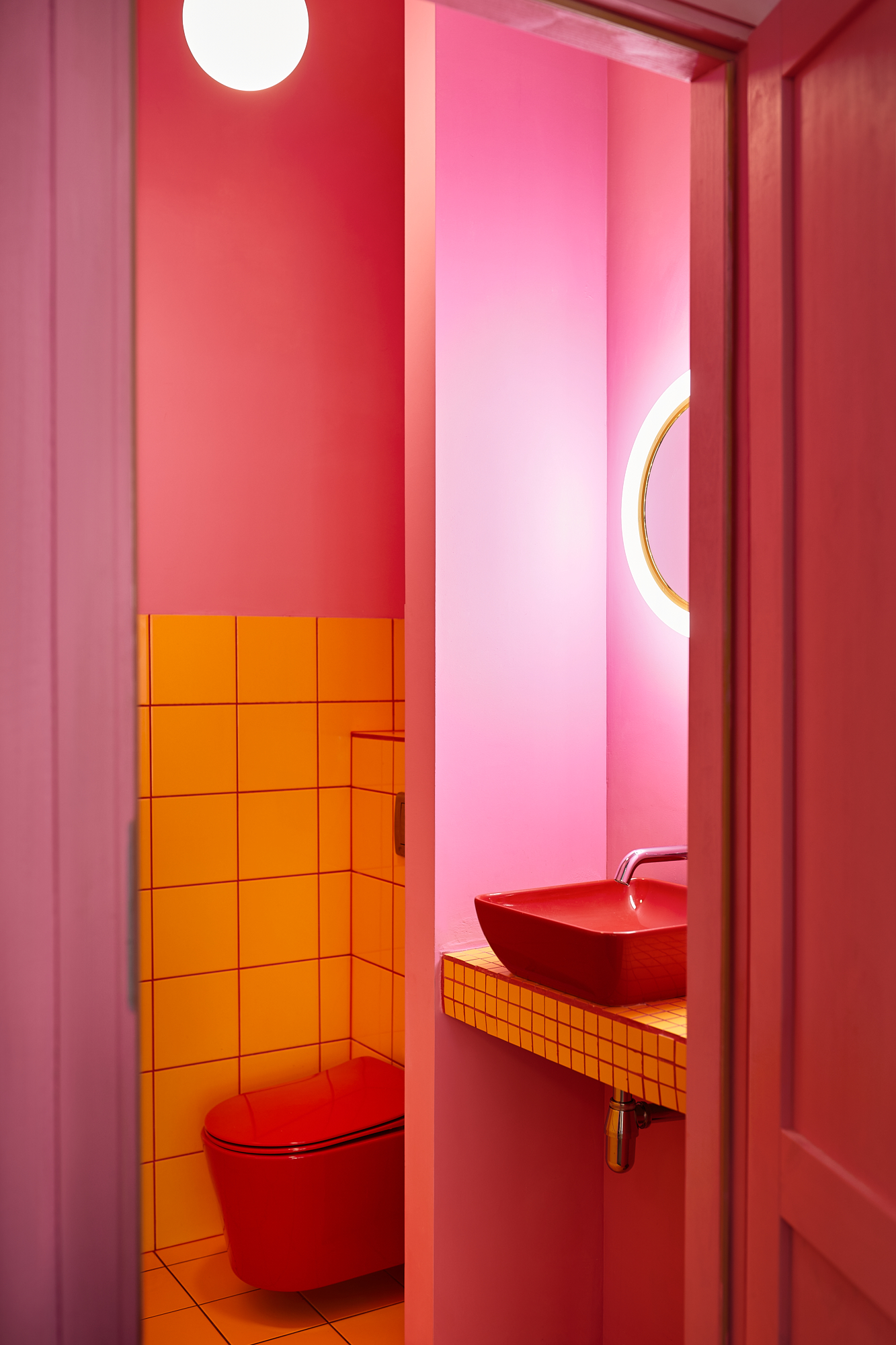 Przeszklona intensywnie żółta witryna z wejściem to pozostałość z lat 90-tych. W Perełce każda ściana jest inna: różowa, kobaltowa, z luksferów, pokryta naturalnym tynkiem lub kwadratowym płytkami. Posadzka i monumentalny bar są wykonane z naturalnego kamienia. Na takiem tle doskonale prezentują się krzesła min.projektu Starca i mix designu z lat 70 i 90 tych. Oświetlenie to mleczne kule, różowa lampa lexavali i kinkiety zbierane przez właścicieli na pchlich targach. Te wszystkie elementy odbijają się w lustrzanym suficie. Jedzenie i napoje podawane są na szkle i porcelanie wyselekcjonowanym przez Lidię. Łazienka to połączenie żółtko- czerwonego gridu z płytek i różowych ścian.